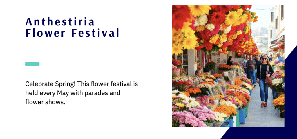 Cyprus’s annual events calendar is packed with vibrant celebrations that showcase the island’s rich culture, creativity, and love for life. Spring kicks off with the Anthestiria Festival, a stunning floral event inspired by ancient Greek traditions. Streets come alive with colorful blooms and artistic displays, celebrating nature’s renewal.