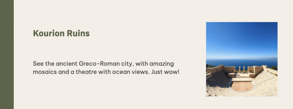 Cyprus is home to iconic landmarks that ignite your imagination and bring history to life. The ancient Kourion Amphitheater is one such marvel, perched dramatically on a cliff overlooking the sea.